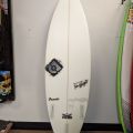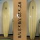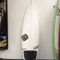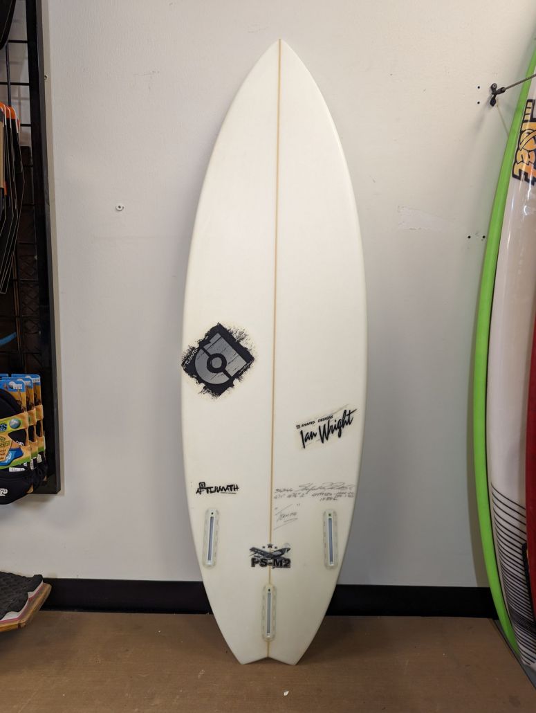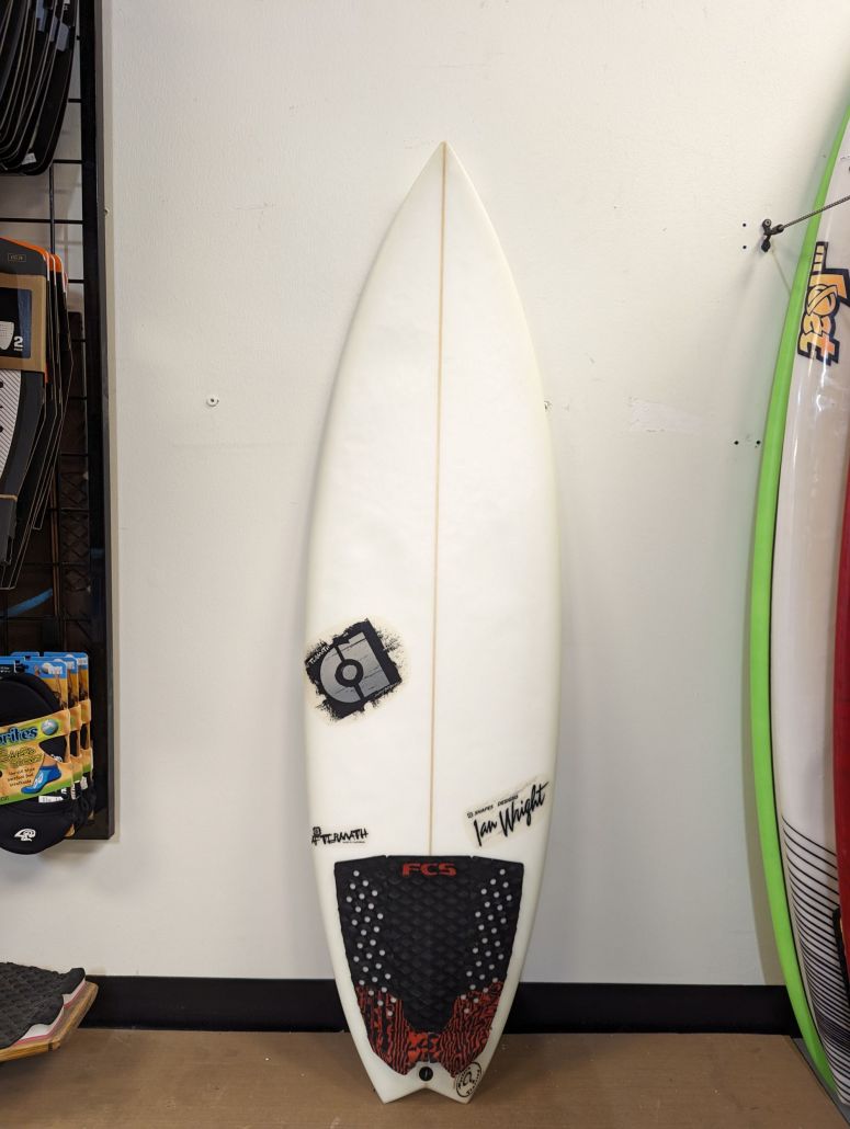 Ian Wright’s grom board is 4’11”, has moderate rocker in tail and lots in the nose, single concave throughout, Tri Futures, 2-4ft +, EPS