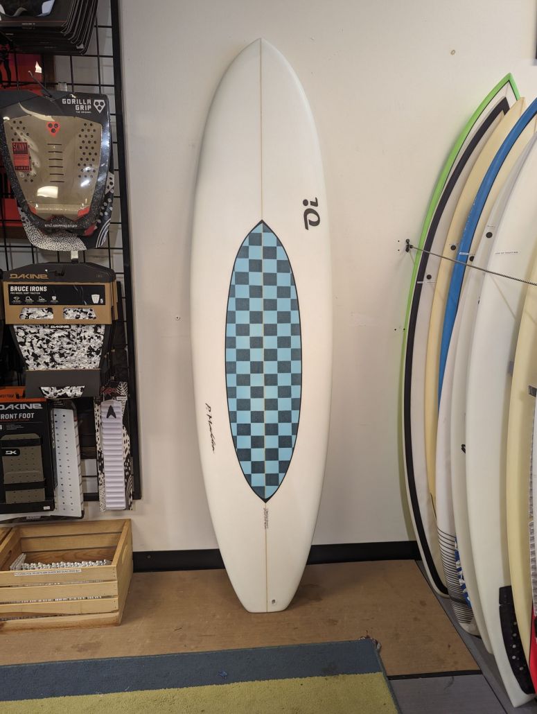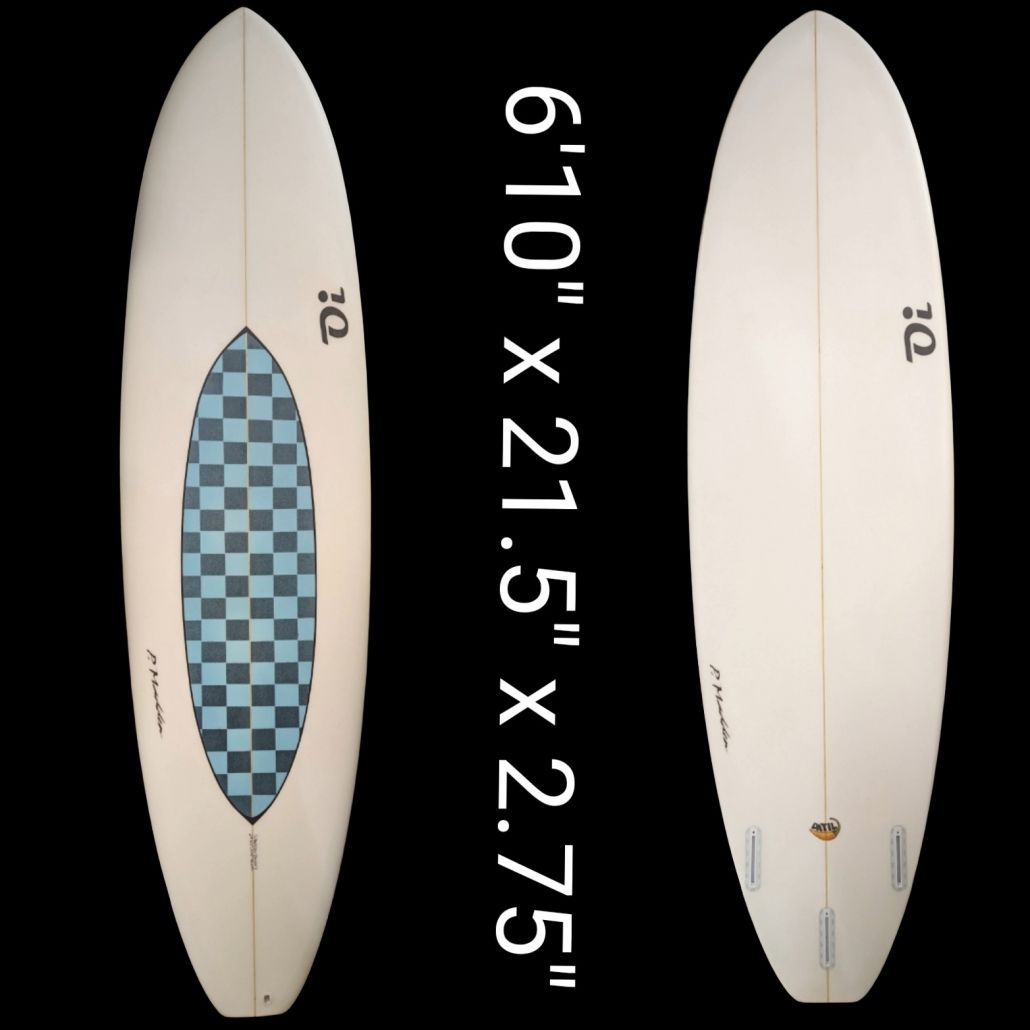 6’10” Oi Checkered Oval, Fins Tri Futures, EPS, Slight V Throughout, Moderate Rocker, Hybrid, Fun Shape, Squash Tail, Waves 2-4ft