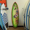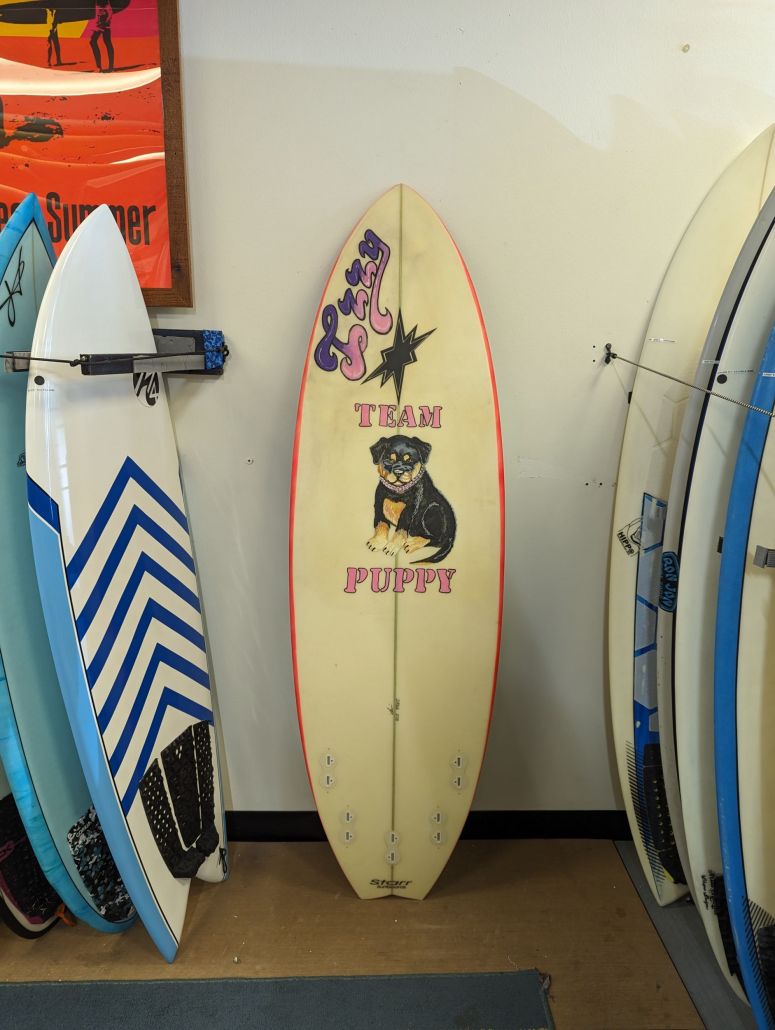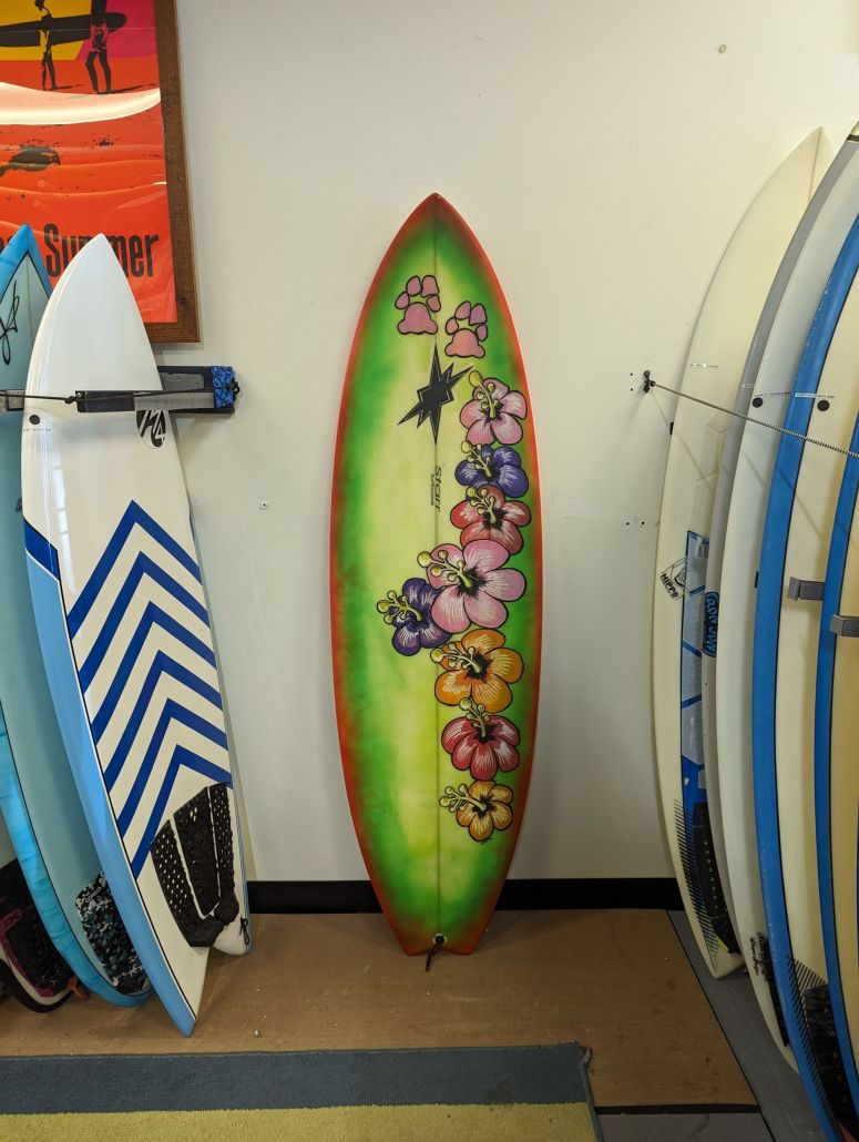 This 5’10” Starr surfboard, hand shaped in Cocoa Beach, Quad – Tri FCS 1 fin boxes (quad set included), slight double concave to vee of the tail, moderate rocker, best in 2-5 ft, EPS