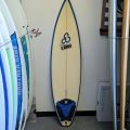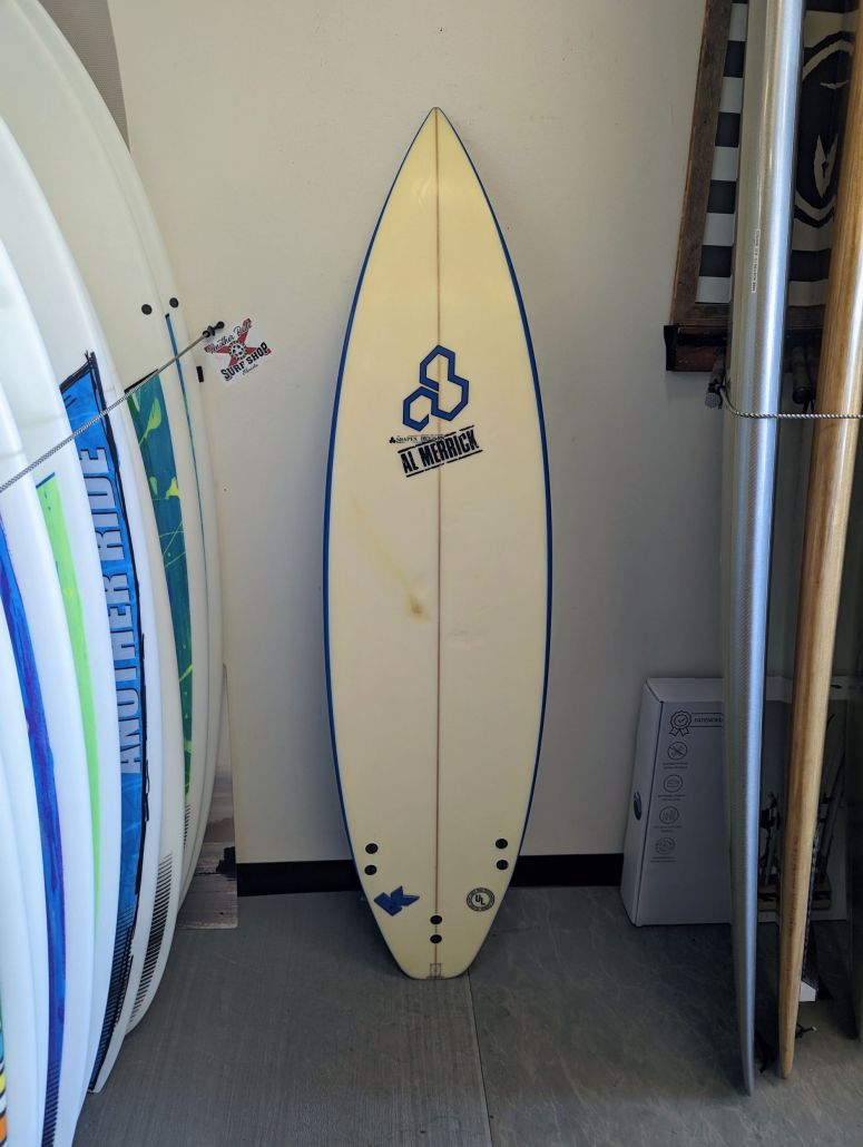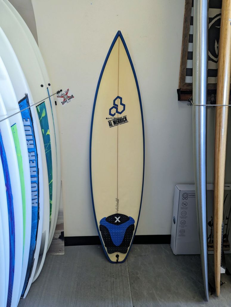 5’11” CI AL Merrick, K Blue, PU, rounded pin tail, Tri FCS 1, narrower outline, more for steeper waves, waves 3-5ft+