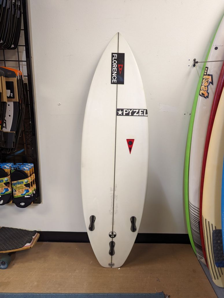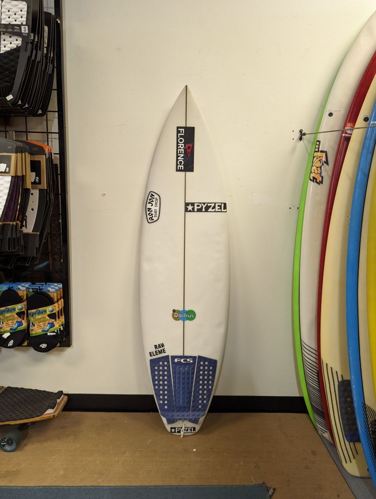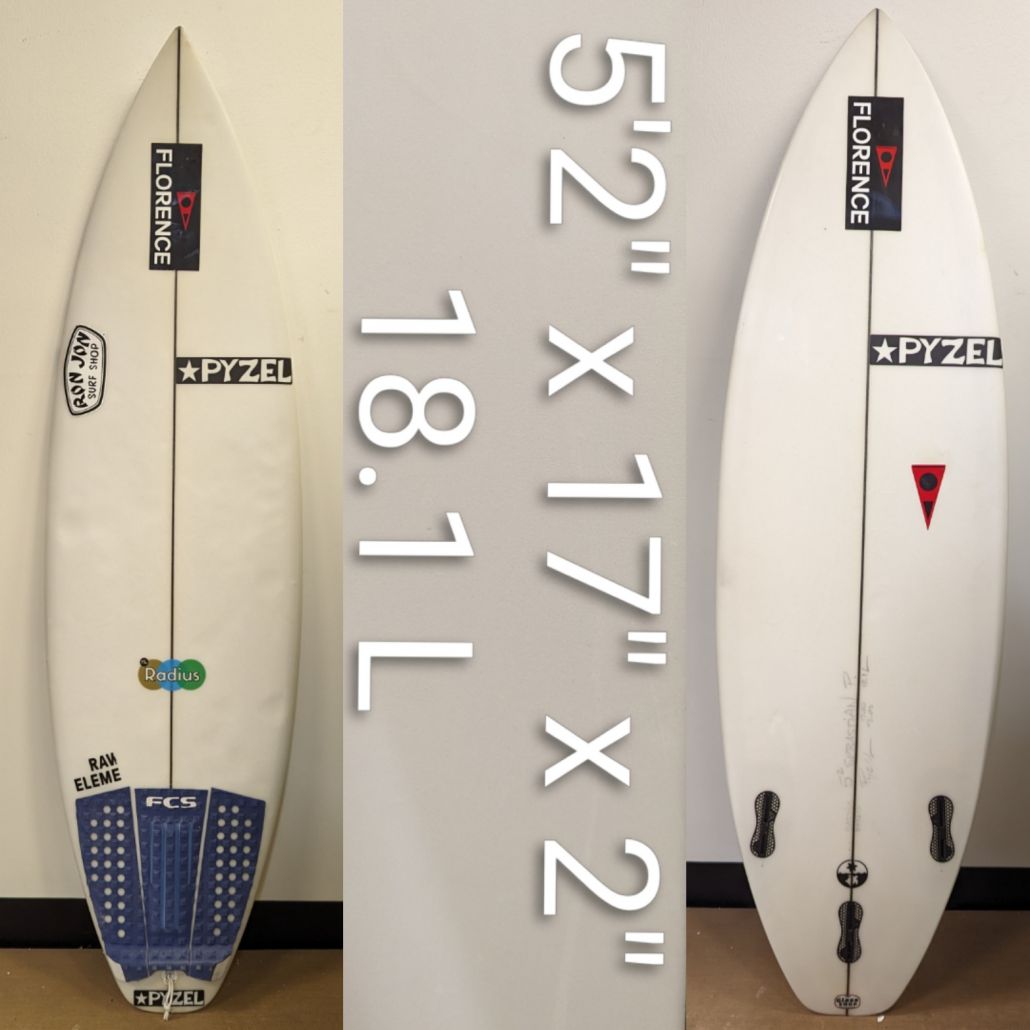 Pyzel Radius is 5’2″ single concave, rocker throughout, pulled in nose and tail, tri FCS fin boxes, 2-4 ft+, PU