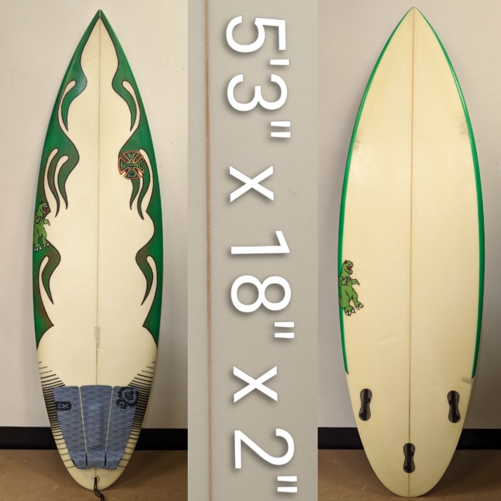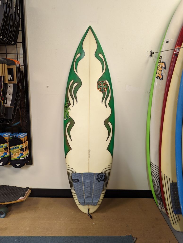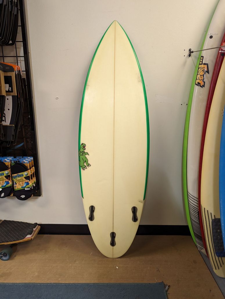 Gordo’s grom performance board is 5’3″, single concave, rocker throughout, pulled in nose and tail, best in 2-4ft+