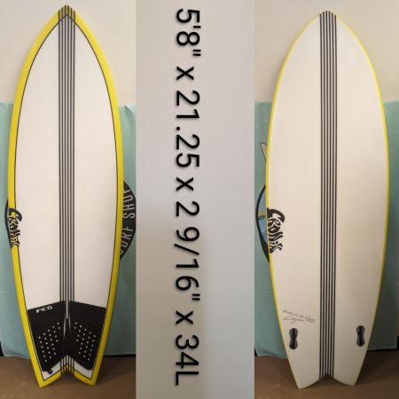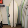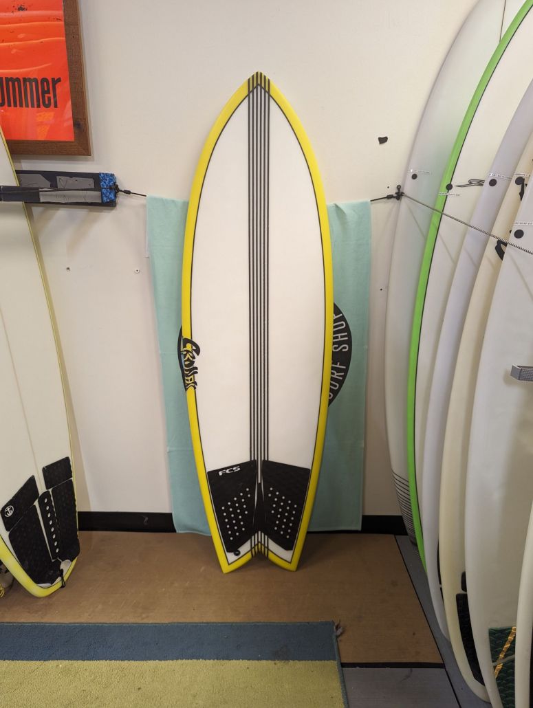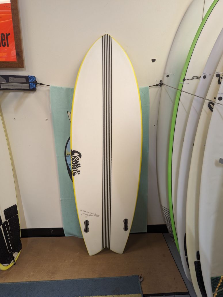 5’8″ Cronin Fish, Twin Fin. Wider tail double concave V off the tail. Moderate rocker, Epoxy. Waves 3′-5′.