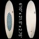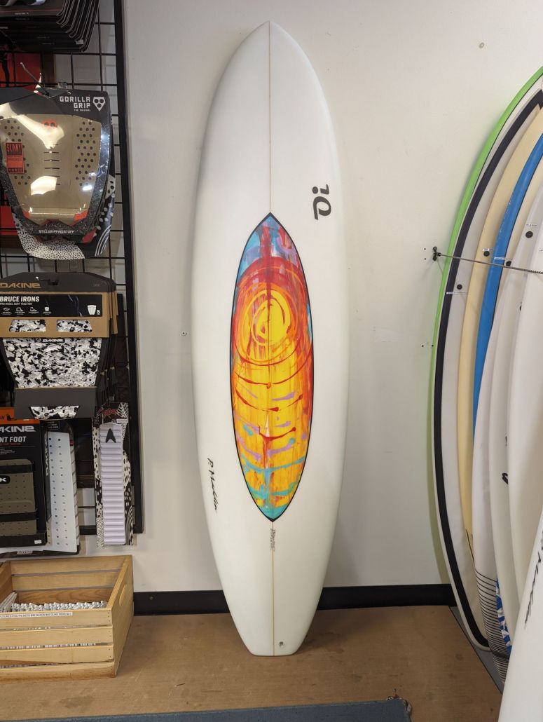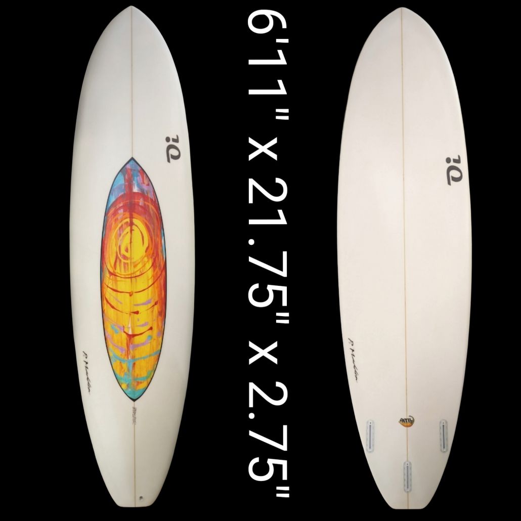 6’11”, Oi Sunburst Oval, Fins Tri Futures, EPS, Slight V Throughout, Moderate Rocker, Hybrid, Fun Shape, Squash Tail, Waves 2-4ft
