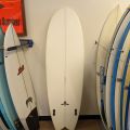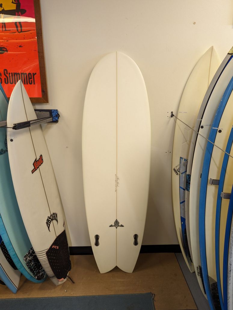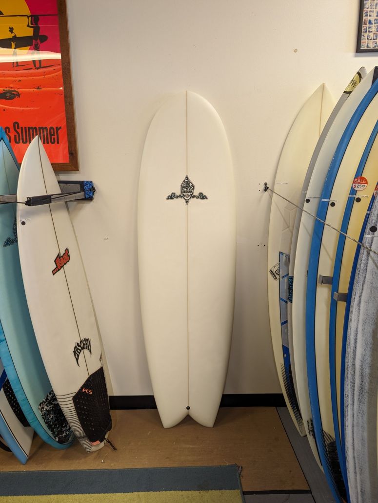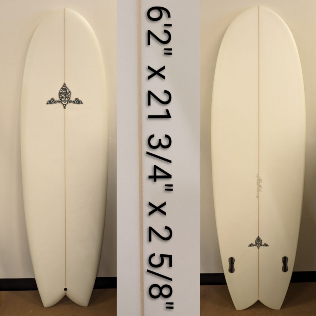 Chris Birch’s Sweet Pea is a 6’2″ short board in the shape of a fun board, Twin Futures fin boxes, Swallow tail, volume throughout, moderate rocker, double concave, vee off the tail, best in 2-4ft, EPS