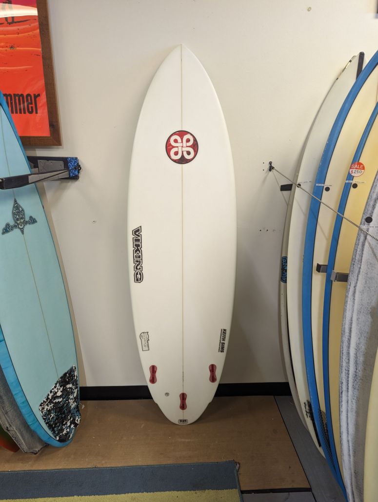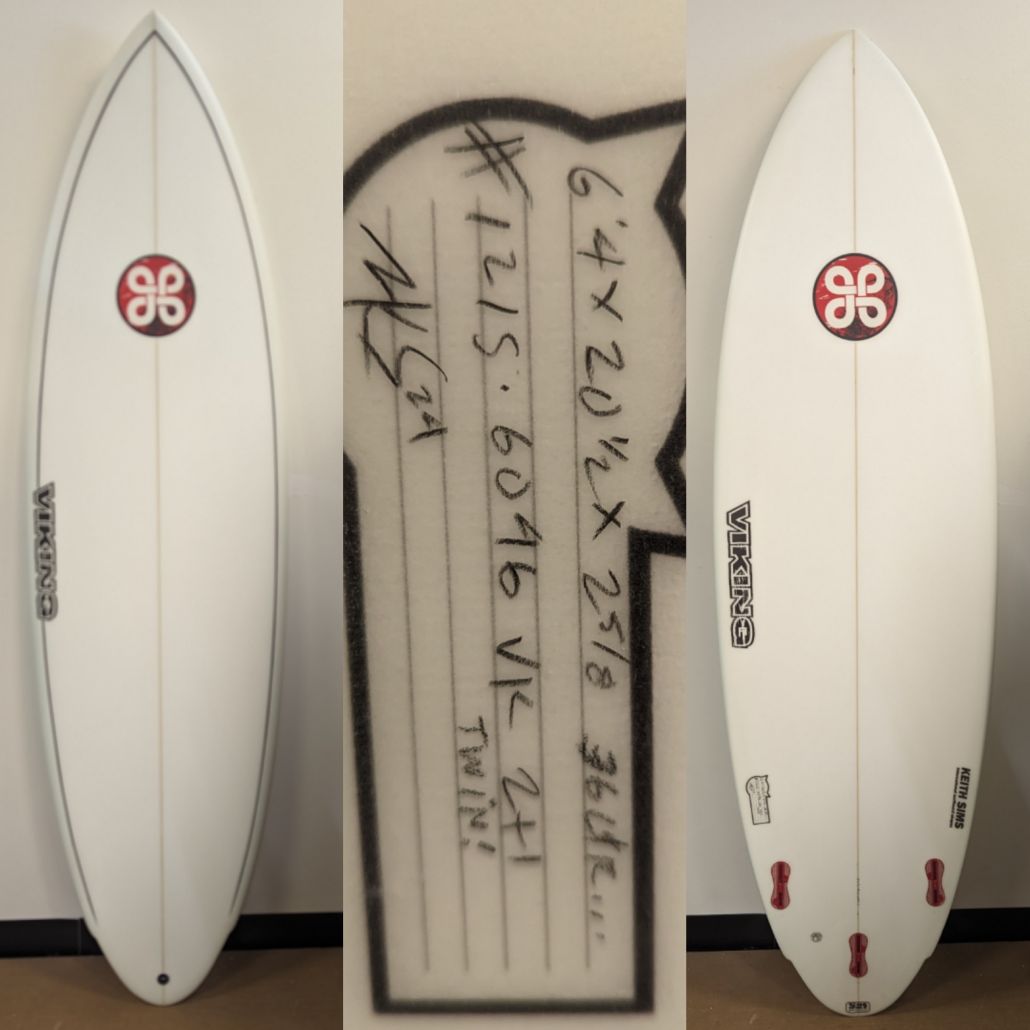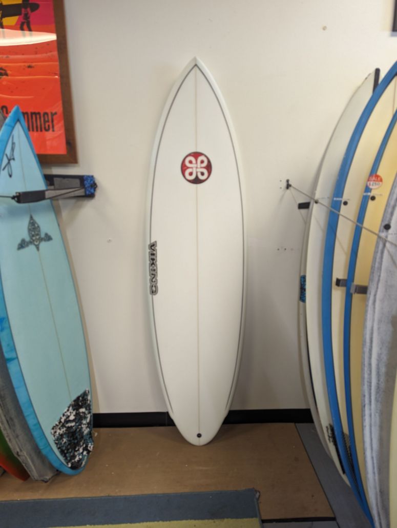 6’4″ Fat Cat Viking Twin, 2+1 FCS 2, rounded pin tail, wider outline, single concave, vee off the tail, waves 3-5ft+