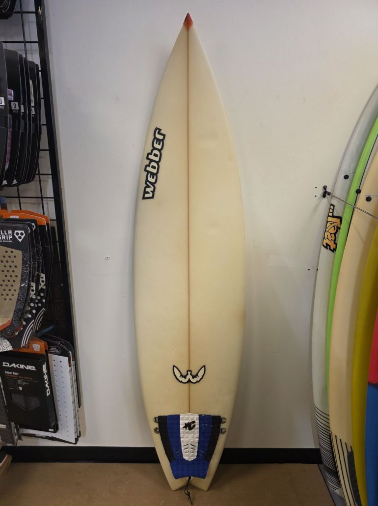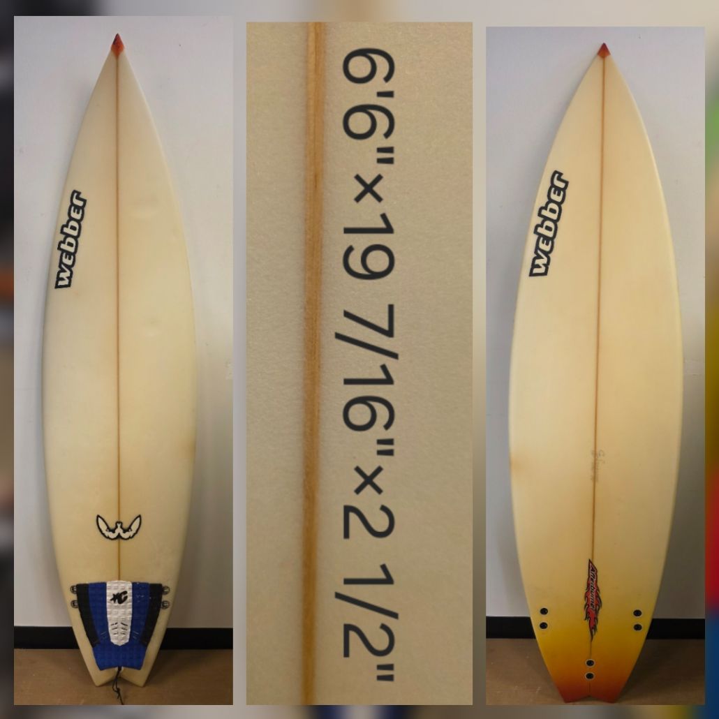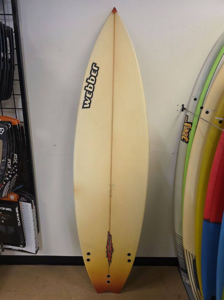 WEBBER AFTERBURNER – A shallow entry concave to deeper double concave into and out of the tail. Standard nose width with wider center and tail width. Lowish rocker throughout but with moderate tail rocker. Fast and free planeshape with strong and drivy bottom shape. A very responsive and forgiving semi-fish for all types of beach breaks.
