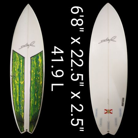 6’8″ AR Hippo, Single Concave, vee off the tail, round tail, Very light, Quad/Tri Futures, If your looking to get better at surfing this is the board for you with the bigger and wider outline for more stability and also a rail reduction on the tail for sharper/more controlled turns. EPS