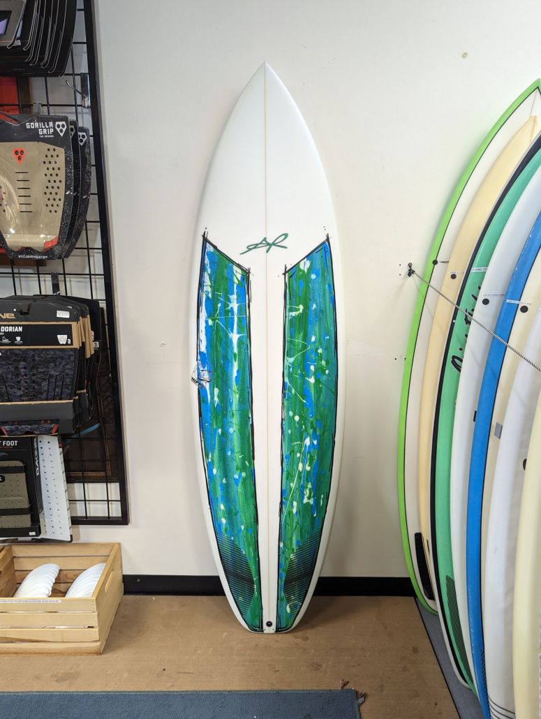 6’8″ AR Hippo, Single Concave, vee off the tail, round tail, Very light, Quad/Tri Futures, If your looking to get better at surfing this is the board for you with the bigger and wider outline for more stability and also a rail reduction on the tail for sharper/more controlled turns.