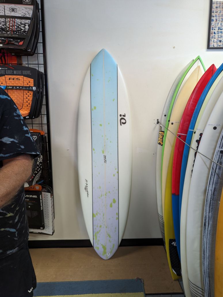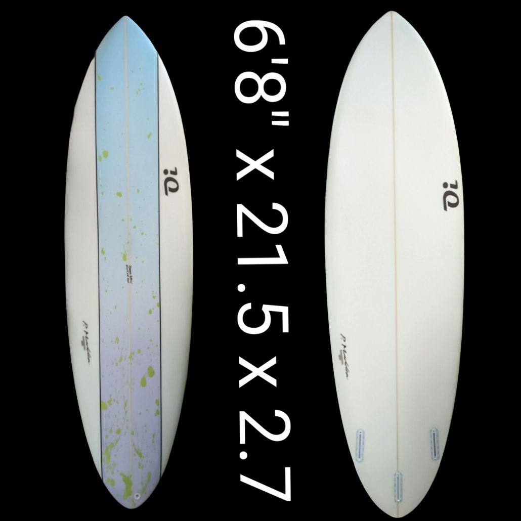 6’8″ OI Midlength, PU, Tri Futures, Single concave, vee off the tail, round tail, thinner rails, waves 3-5ft+