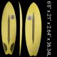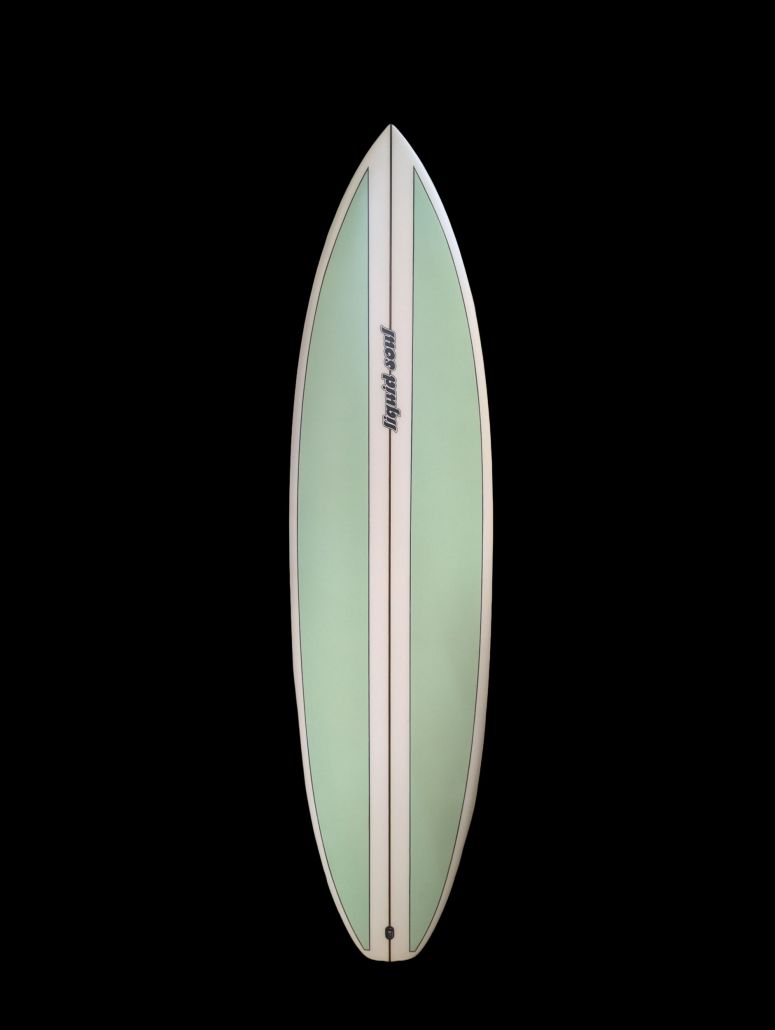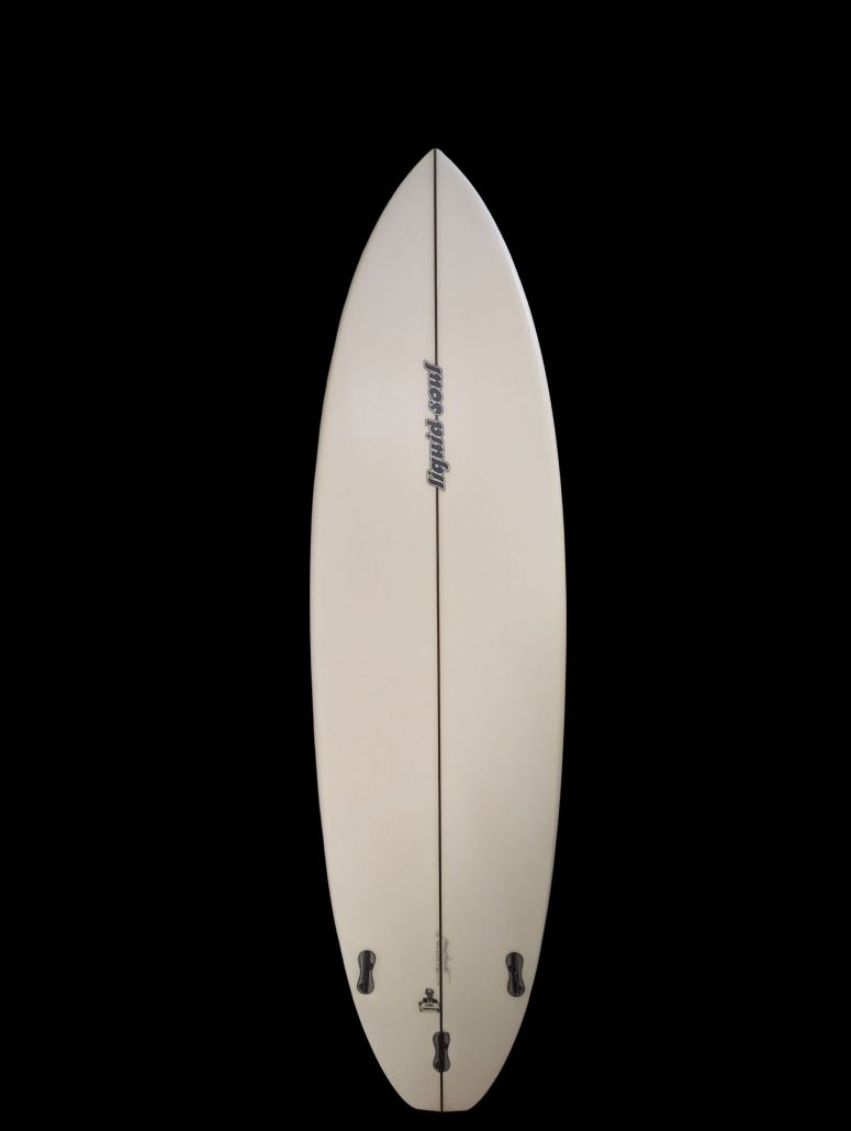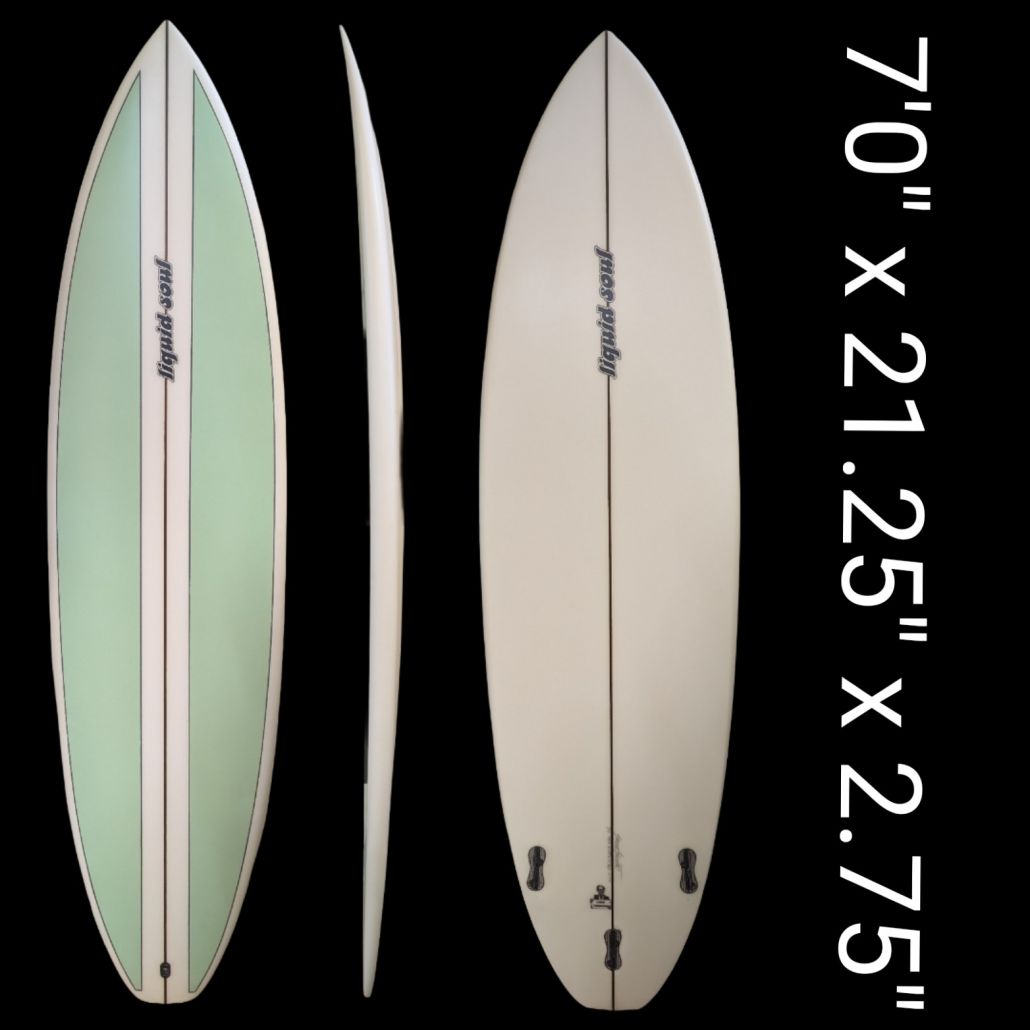 Liquid Soul mid length has moderate rocker in lower 2/3 more in upper 1/3, thickness throughout , pulled in nose and tail, double concave to flat off the tail, best in 2-4 ft, PU