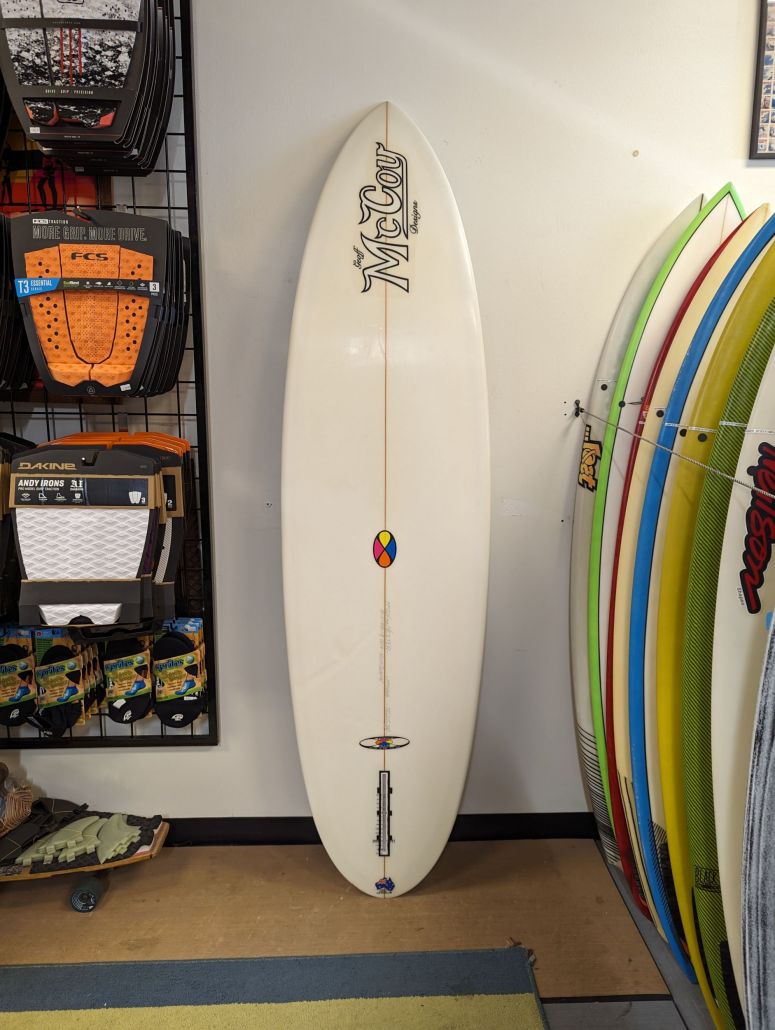 7’2″ McCoy Astron ZOT, beaked nose, rounded pin tail, midlength, single concave, single fin, hybrid, PU, slightly wider outline, Waves 3-5+