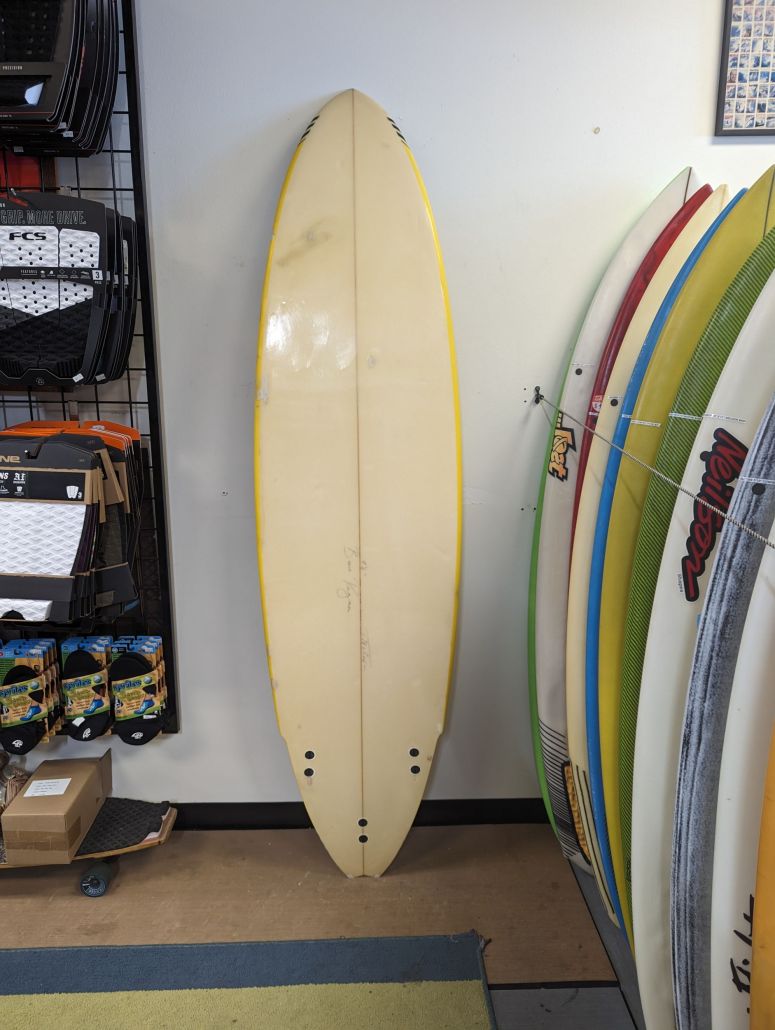 7’2″  Quiet flight sting fish, PU, FCS 1, double concave, small swallow tail, moderate rocker, waves 3-5ft+