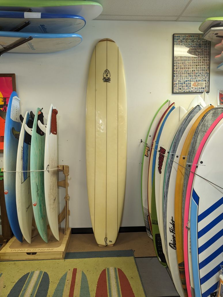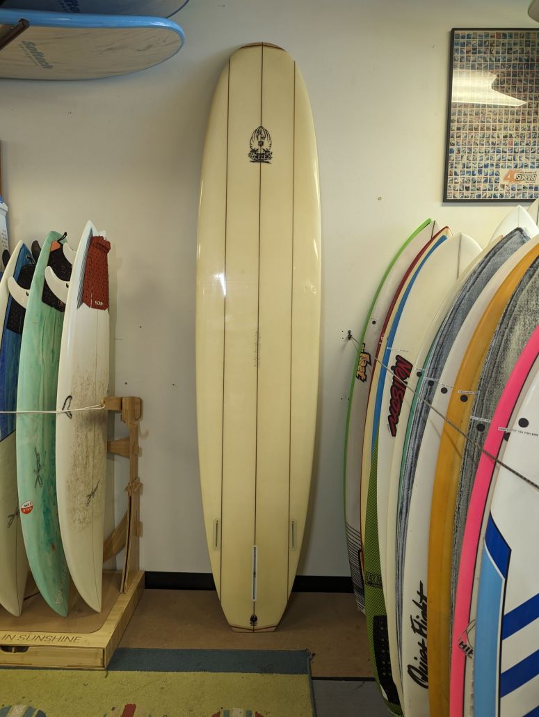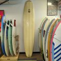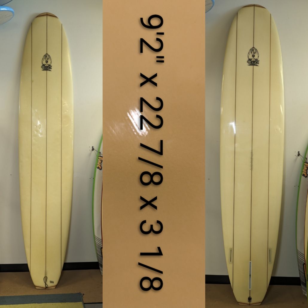 9’2″ Reflex Longboard, nose and tail wood blocks, Clark Foam, PU, Single concave, slight vee off the tail, moderate rocker, 2+1 Futures fin boxes, waves 2-4ft+